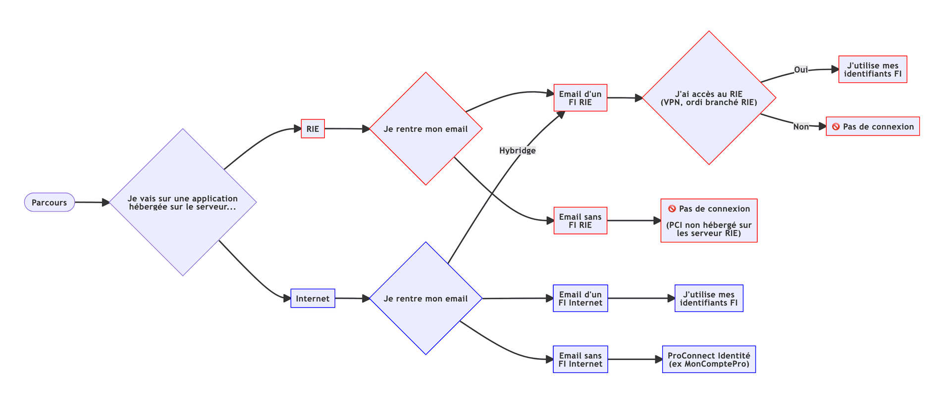 ProConnect sur ses serveurs Internet peut utiliser des Fournisseurs d'Identité sur Internet et sur le RIE (pour le cas du RIE, à condition que l'agent ait accès au RIE via un VPN un un accès direct).